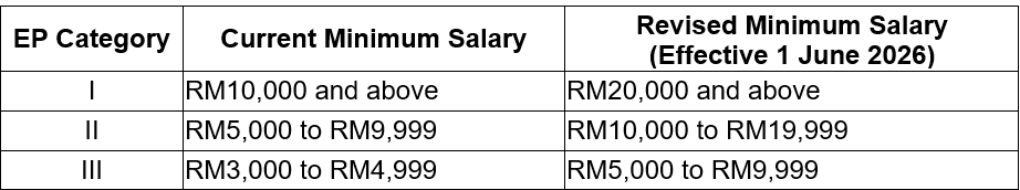 Please be informed that the Ministry of Home Affairs (Kementerian Dalam Negeri (KDN)) has revised the minimum salary requirements for Employment Pass (EP) Categories I, II, and III. These revisions will take effect on 1 June 2026.
