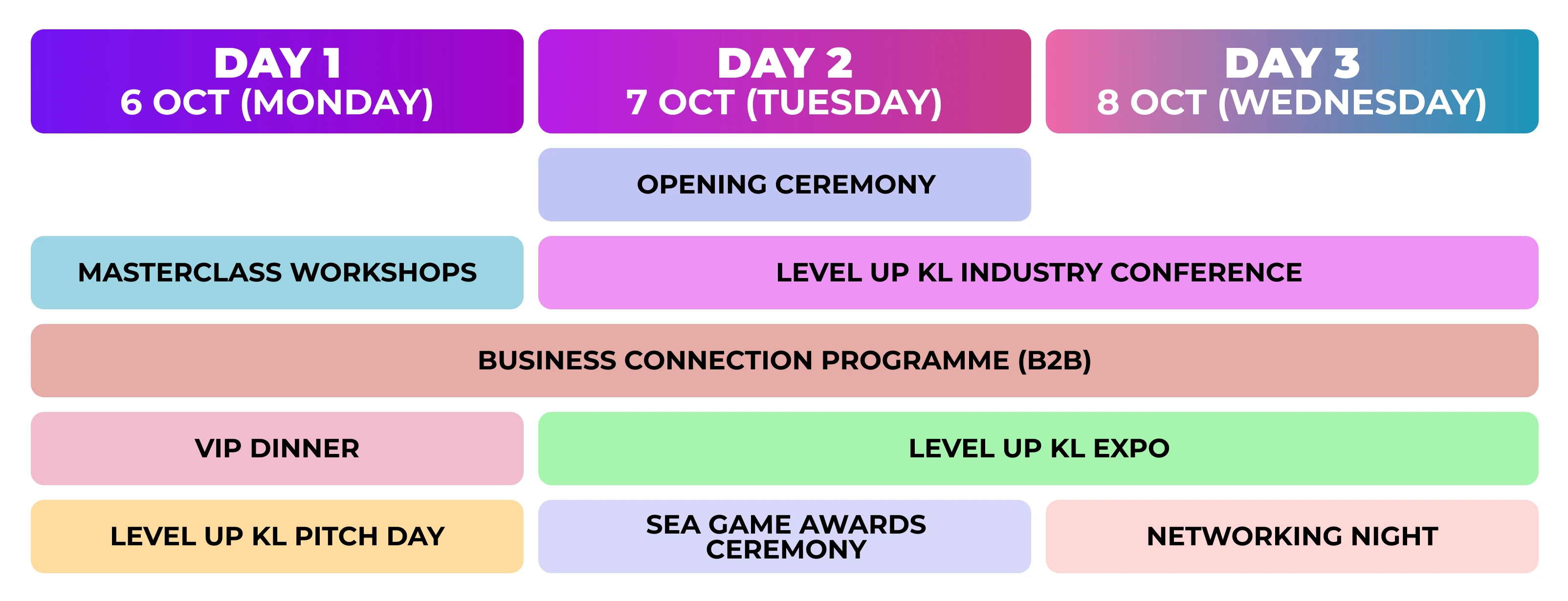 Key highlights of LEVEL UP KL include the Industry Conference, Business Connection Programme, Exhibition, Pitching Day, SEA Game Awards Ceremony, and Masterclass Workshop.